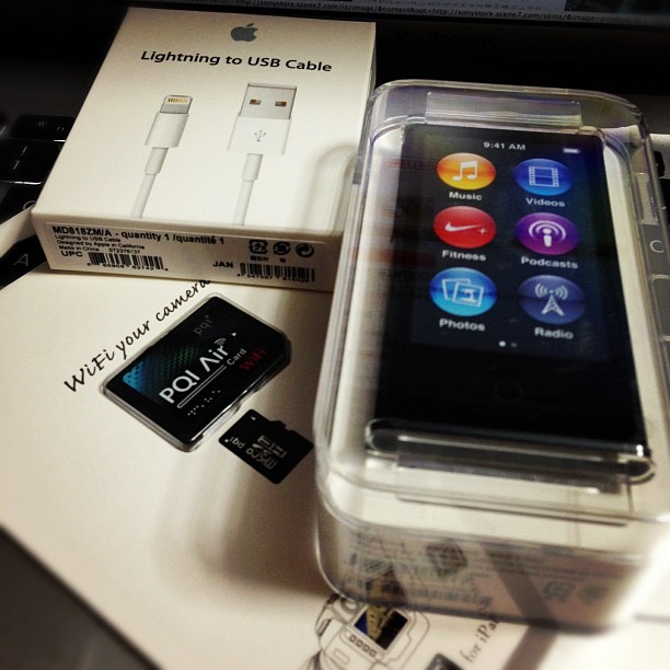 iPhone5買ったばかりなので、touchには全然興味が無いので、ライトニングケーブルと耳ドライヤーイヤフォン(EarPod)の予備としてiPod nanoの黒を買ってみた。12800円か。