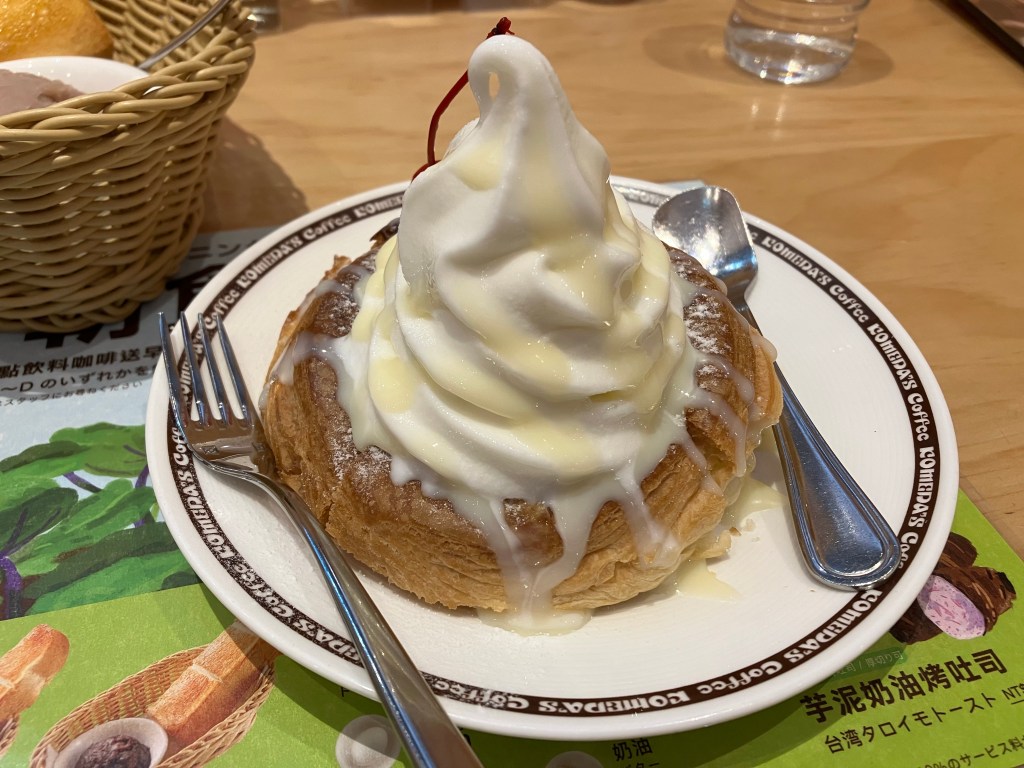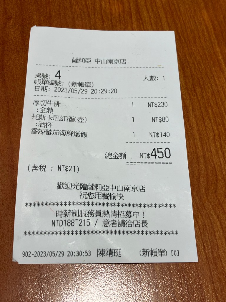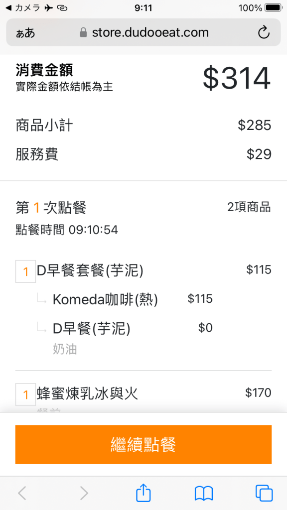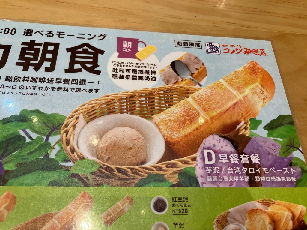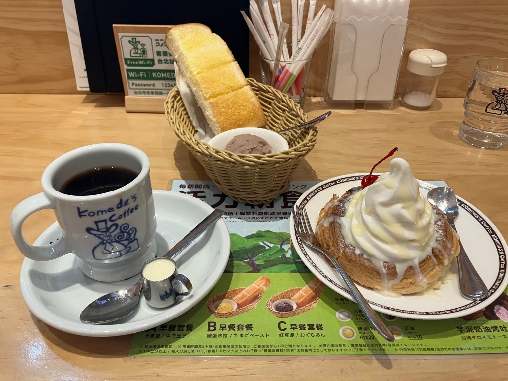 モーニングはノーマルのコーヒー代のみだから115NT$で517円程度。まあ、札幌でモーニングキメるより安い(コメダ札幌狸小路2丁目店、550円)。が、聞き慣れない服務費が10%別途加算されているのでざっくり570円くらいか。そう考えると、札幌よりは高いな。ちなみに帯広のコメダは480円で500円でお釣りが来た。地域価格差ってつけてたんだっけ?