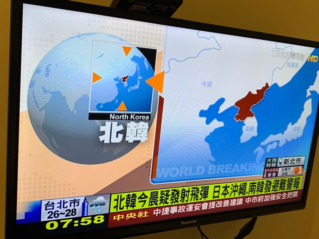 ちょうど起きて現地のライブニュース番組をつけっぱなしにしながらネット徘徊していたのだが、おそらく北朝鮮の言うロケットの進路に台湾近海もあったように記憶していたが、飛んできたわけだ。いい機会なので各国のニュース放映局をザッピングしていたが、NHKの外国向けのチャンネルで、災害カットインの「ミサイル警報」が流れている以外、他のテレビ局は平常運転。速報を差し込むこともなく、延々とその時影響があるのでは?というような台風情報や地元のニュースを流していた。