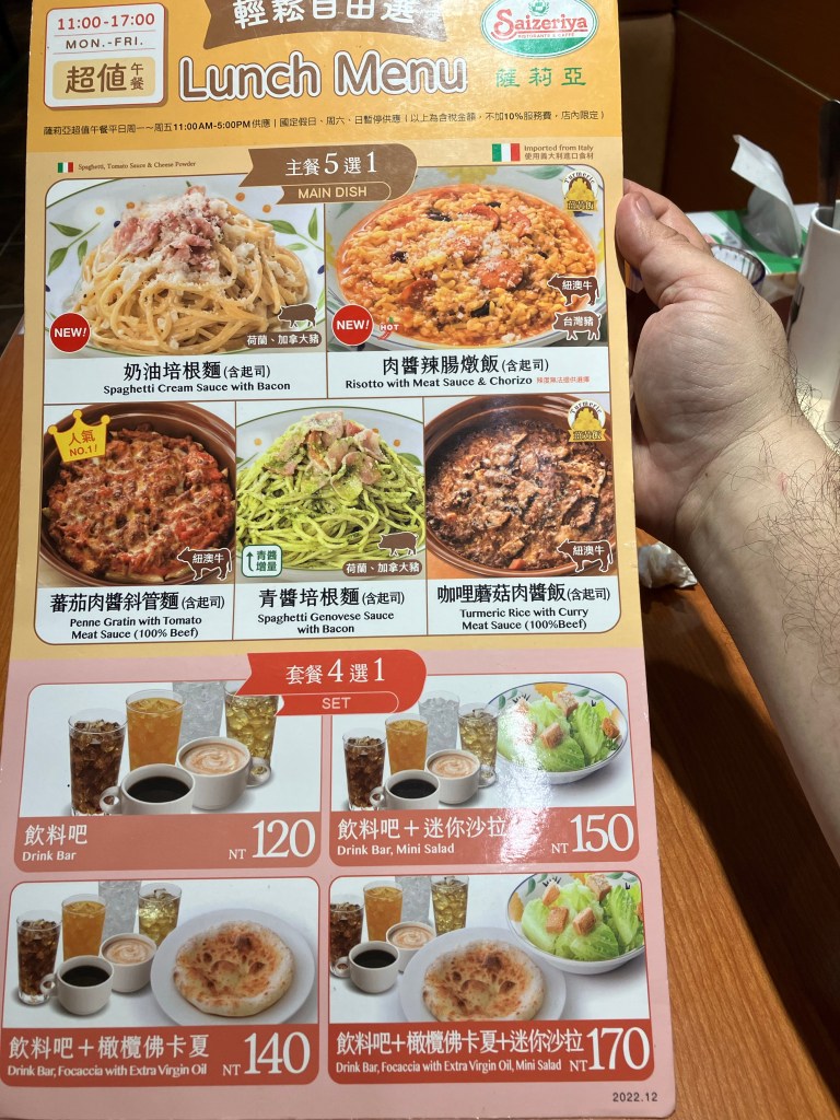 みんな大好きサイゼリヤは、台北にも数軒あって、初めて行ったときには昼時にめちゃ混んでてなんじゃコリャ感があったが、いまは落ち着いているのかな?日本のサイゼリヤと同じくらいスムーズに入れる。